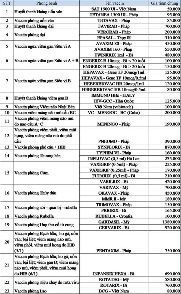 - Vaccin ngừa viêm gan siêu vi B: HEPAVAX – Gene TF 20mcg/1ml – 135.000 đồng. HEPAVAX – Gene TF 10mcg/0.5ml – 95.000 đồng. HEBERBIOVAC HB 20mcg/1ml – 120.000 đồng. HEBERBIOVAC HB 10mcg/0.5ml – 80.000 đồng.