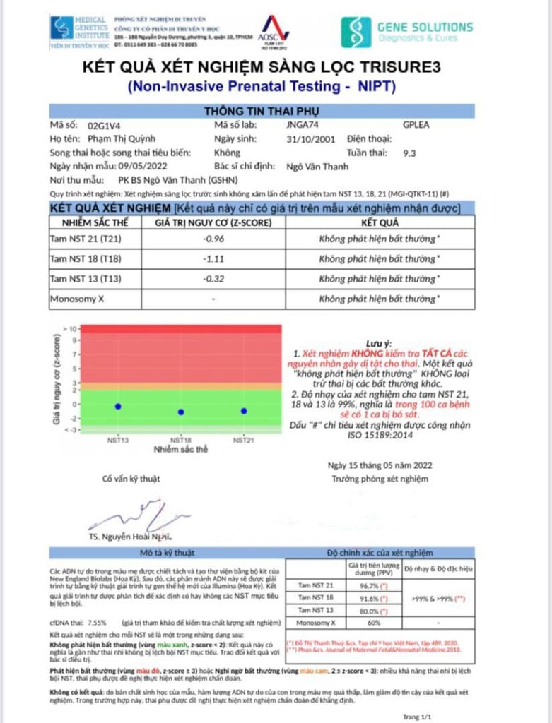 Với những trường hợp kết quả NIPT bình thường, trên phiếu sẽ có nội dung: